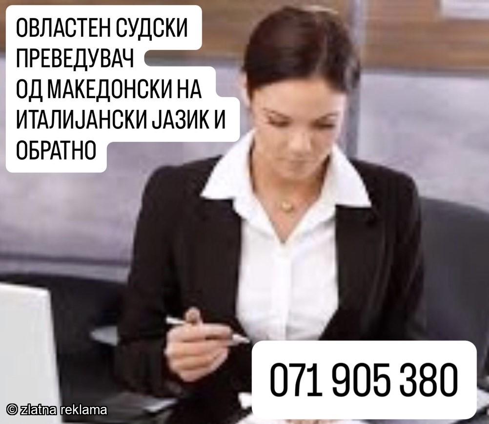 Овластен судски преведувач врши превод на секакков вид документација од македонски на италијански и обратно.
