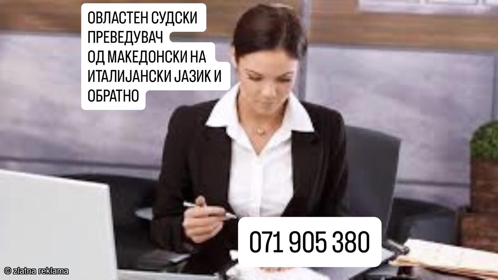 Овластен судски преведувач – Италијански ↔ Македонски Со над 25 години искуство во професионалните преводи, нудам врвна точност, доверливост и брзина. Преведувам...